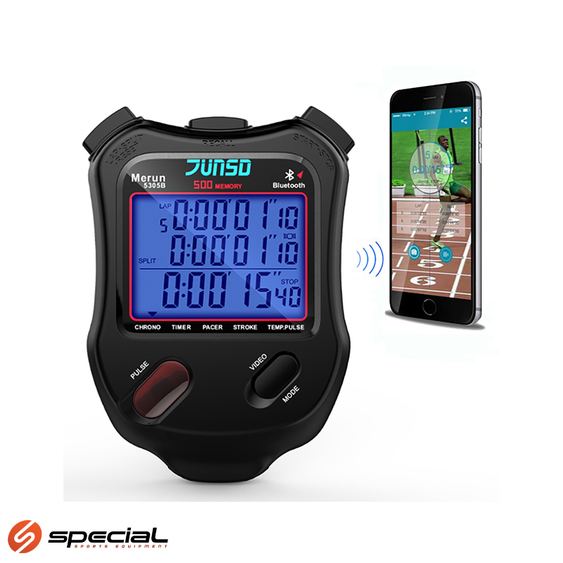 Štoperica s 500 konačnih vremena, spojiva putem Bluetooth tehnologije sa pametnim telefonom. Telefon snima fotografiju i bilježi vrijeme svaki put kada pritisnete odgovarajuću tipku štoperice. Podesivi ritam (tempo), odbrojavanje dva uzastopna vremena, alarm, vrijeme i datum. Mjerenje vremena do 10 sati s točnošću od 1/100. Sat je otporan na slučajni kontakt s vodom, poput prskanja ili kiše, ali u tom slučaju nemojte pritiskati tipke. Štoperica nema umetnute baterije (1x CR2032), one su uključene u pakiranje. Prije početka upotrebe umetnite ih prema uputama za uporabu.