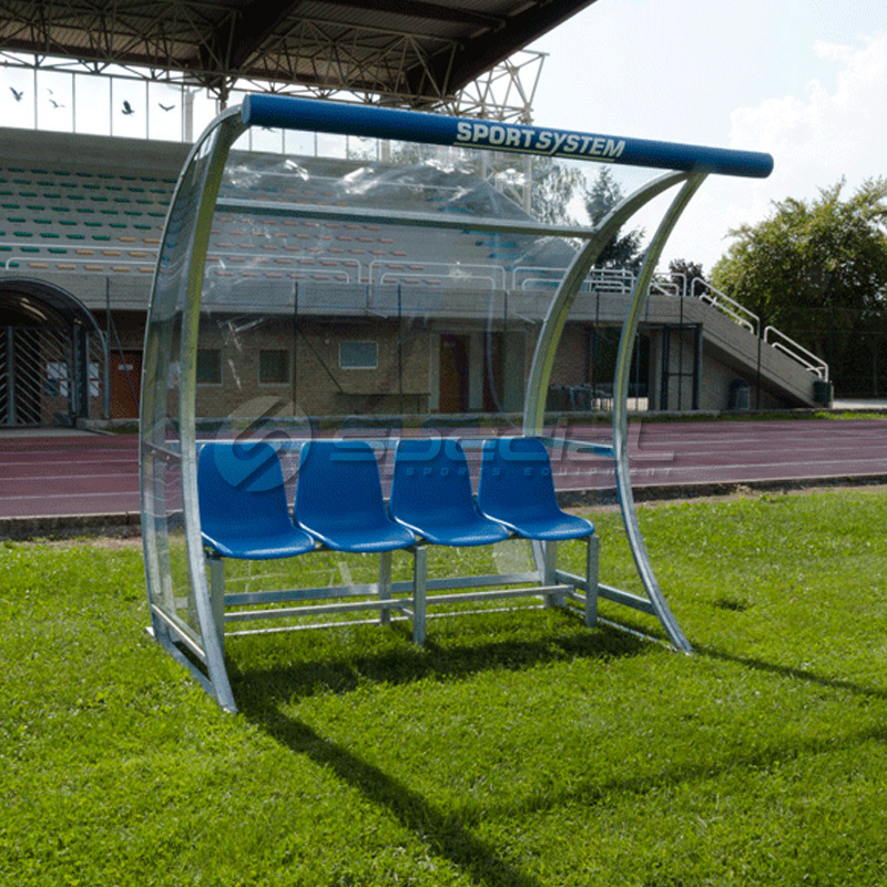 Klupa za rezervne igrače zaobljena. Konstrukcija metalna pocinčana. Prekrivena prozirnim polikarbonatom 3 mm sa mekanom zaštitom. Sjedalice PVC sa naslonom.