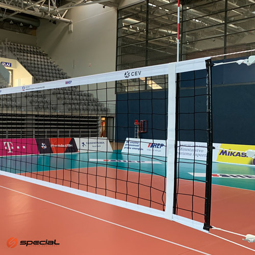 Mreža za odbojku - PRO PRINT T sa dvije PVC trake 7 i 5 cm, dimenzije 9,5x1 m, debljina 5 mm, s tiskom logotipa na gornjoj traci. Komplet sa kevlarskom špagom. Antene i jastuci za antene u kompletu.