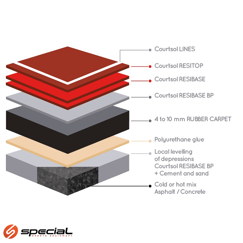 Posebnost COURTSOL COMFORT sustava je u nanošenju Courtsol smola preko meke gumene podloge zalijepljene na podlogu.